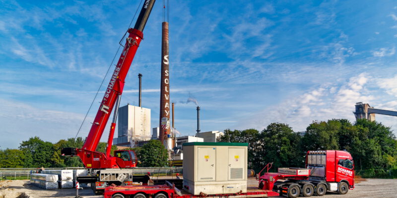 Unsere Transformatorstation ist aufgestellt worden, somit wird die Energieversorgung unserer neuen Anlage und des zukünftigen Betriebsgeländes mit Strom aus dem Holzkraftwerk sichergestellt.